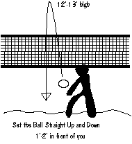 How and Where To SetConsistency! Everything that you will read in these How To Articles has as its basis, consistency. Doing the same thing over, and over, and over, again, and again, the same way, with the same result is the single most important thing you can do on the beach. You dont have to be bigger, stronger, or even better skilled than the other team, just more consistent and able to side-out when you receive serve, and you will win. Remember, they cant score points if you side-out, and you cant lose, if they cant score points (even in a rally game). Where to pass the ball was covered in an earlier article. Now we have to get to the passed ball and set our partner so that they can hit the ball. Once you realize that youre not going to pass the ball you should start to move into your setting position. You dont want to get all the way up to the net, about halfway to the position that you expect the pass to go will do. This will allow you to recover if your partner doesnt make a perfect pass (shanks) and at the same time you wont have to rush to get to a good pass. Ideally, you will be one to three feet off the net and directly facing where you want the set to go. You must learn to bump set the ball consistently and accurately because your partner will not be able to give you a pass that you can handset every time. Additionally, when you bump set the ball no referee can ever call you for bad hands. The following applies to a good pass: You want to set the ball virtually straight up, so that if the ball were not to be hit it would fall one to two feet in front of you and one to two feet off the net. The ball should reach a height of 12-13 (that is 4 to 5 above a mens net) and, if possible, you want the ball to have a slow forward rotation (toward the net).