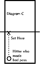 That usually means halfway between you and the net and halfway between where you and your partner are. (See Diagram B) This leaves plenty of room for error while still allowing your team to get the ball over the net. If you are more comfortable with your setting skill, then you really have several options. However, the safest thing to do is to always try to set halfway between you, your partner, and the net as shown in diagram B. First thing to consider when you are trying to set a bad pass is whether your team served or the other team served. If you served the ball, and you try to make a tough set and miss it, its only a side-out rather than giving up a point. At the same time though, you are also giving up the chance for a point and those chances can be hard to come by. On a pass that has been shanked and is well off the net (more than 15 away) that you can still reach comfortably and you do decide to set the ball to the net, always make sure that you communicate your intention to your partner so that he isnt waiting way off the net and has to rush to catch up with your set. Dont try to keep this a secret from the other team. It is much more important that your teammate know the set is going to the net than it is to surprise the other team. You may surprize both the other team and your partner, resulting in the ball landing on your side of the net without your partner hitting it, if you try to be deceptive. So, be loud, when you tell your partner what you are doing. Now that you have decided to try and set your partner on the net how do we decide where the ball should go? First, aim the ball to the spot on the net directly in front of your partner.(See diagram C)
